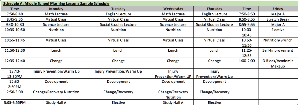 To facilitate a completely personalized curriculum, all of our middle school students have a core curriculum that is built on our accredited and NCAA-approved blended hybrid education platform. This personalized platform blends virtual classrooms, with a paced and monitored learning schedule, two times a week in person lectures with our professors in each of the core classes, and continual academic support through our SAAS department (see below). In these lectures our professors teach key concepts, foundational material, and lessons involving hands-on real world application to reinforce the weeks lessons.